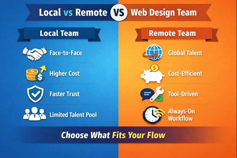 You can work with a local team or go global by hiring a remote web design team. Both are valid, and both can fail or flourish. A local team often offers comfort. You can sit across the table, sketch ideas on paper, read faces, and feel the tempo of work.